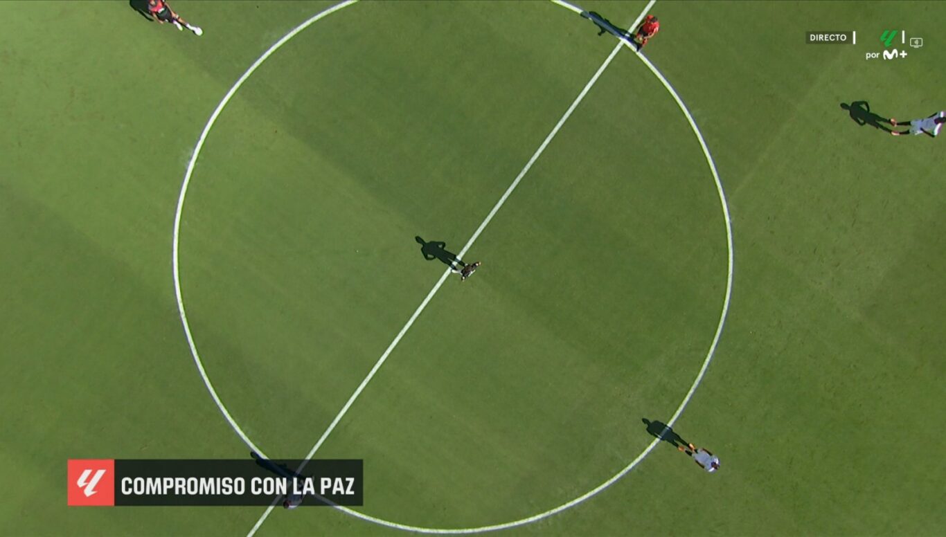 Esa indignación ha debido calar en la patronal puesto que en el Sevilla Mallorca de este sábado sí se pudo observar a través de un plano cenital la protesta de los futbolistas, aunque en un rótulo se leía «compromiso con la paz».