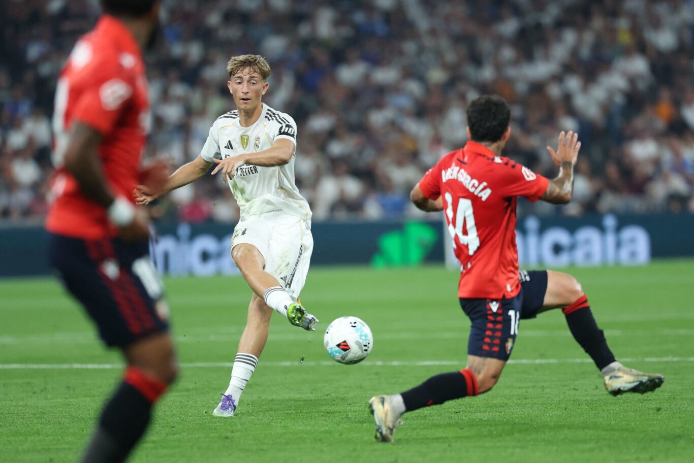 Tchouaméni, Valverde y Güler formaron el eje central, pero el bloque ultrabajo de Osasuna, con una doble línea de 5 en campo propio, convirtió a Huijsen y Carreras en centrocampistas y embotelló el ataque madridista, de más a menos durante el primer tiempo y algo desesperado al descanso.