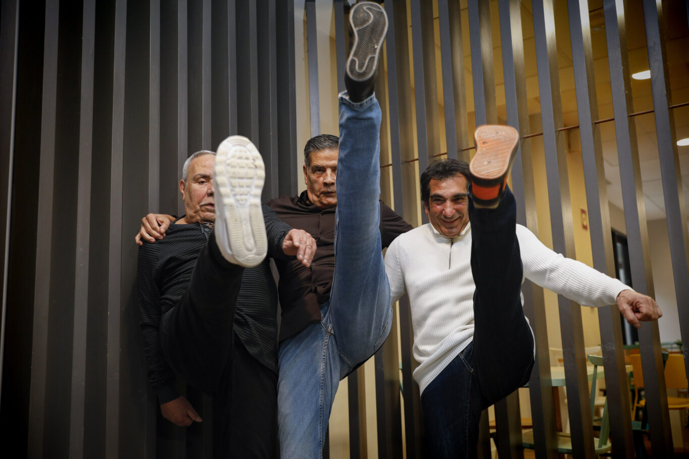 Cuando aparece el fotógrafo, Los Chunguitos están calientes. Tienen unos cuantos chascarrillos todavía por contar. Se mueven como un sonajero, llevan la estela del soniquete. Visten unos abrigones juveniles rellenos de plumas y por las zapatillas blancas sube, como el vapor en un respiradero del Metro, la obsesión que alimenta la nueva etapa. Los cuidados, un brillo, la apariencia fresca, tratan de poner un dique de actitud y estilismo al paso del tiempo. También hay deporte. Taíno -«a mí me pusieron taíno porque tenía el pelo zaíno, como los toros», comenta Jose Salazar– sube la pierna a la altura de la cámara. «Bruce Lee», dice Jere, al que le pusieron Jere por su padrino, un jerezano. Juan Salazar lleva el sobrenombre de Machote. Solo se ha tocado «un poco» la nariz. ¿Machote? «Porque pesé siete kilos cuando nací», justifica. «No exageres», corrije Taíno. «O seis. A mí madre le dijeron ‘ha tenido un machote’. Pues Machote».