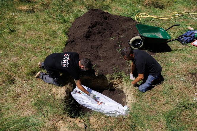 Au fond du cimetière de l’Orme-à-Moineaux, aux Ulis (Essonne), une parcelle en friche, destinée aux déchets verts, accueille l’expérience. Pour les familles venues se recueillir sur la tombe de leur proche, impossible de deviner ce qui se passe derrière le mur et la végétation verdoyante. De l’autre côté du cimetière, un centre de traitement des données tourne à plein régime. Seuls les passagers des avions qui viennent de décoller de l’aéroport d’Orly pourraient apercevoir des humains qui manipulent des carcasses animales.