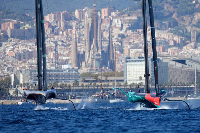 Les bolides des mers volent au-dessus des vagues. Leur coque de près de 22 mètres de long soulevée par les foils (sortes d’ailes d’eau), les AC75 glissent sur l’eau à près de 50 nœuds (92 km/heure). Au large du Port olympique de Barcelone, des dizaines de grands yachts, des charters touristiques et des petits bateaux se font une place, coque contre coque derrière les bouées délimitant la zone de compétition de la 37e Coupe de l’America, afin d’avoir la meilleure vue sur les manœuvres des futuristes monocoques. Dans les installées sur la plage de la Barceloneta et le Port Vell, des écrans géants permettent aux spectateurs de mieux comprendre ce qui se passe à bord, à quelques mètres au large. Depuis le 12 octobre, coup d’envoi de la finale entre le britannique Ineos Britannia et le néo-zélandais Emirates Team New Zealand, les supporters « kiwis » du tenant du titre y ont afflué. Vainqueure, samedi 19 octobre, de la neuvième régate (7-2), leur équipe a remporté pour la troisième fois d’affilée la plus ancienne compétition internationale de voile – elle remonte à 1851.